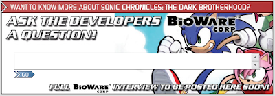 Ha aparecido una página, específicamente EB Games Australia, donde estan planeando una entrevista con BioWare sobre Sonic Chronicles, y los usuarios pueden fabricar preguntas que se les puede hacer a ellos. Yo en lo personal ya formulé mi pregunta, y espero que la respondan, mas que nada referente al espacio entre las dos pantallas, donde muchos juegos de SEGA lo consideran, pero hay algunos que no, y en las imágenes publicadas, no pareciera que lo tomaran en cuenta.